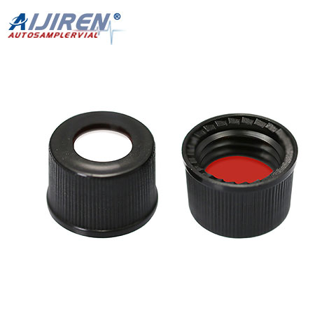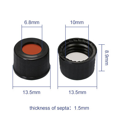 | Description | White PTFE/Red Silicone Septa, 10mm Black Screw Polypropylene Cap, 7mm Centre Hole |