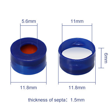 Pre-slit Blue PTFE/White Silicone Septa, 11mm Blue Snap-top Polyethylene Cap, 6mm Centre Hole |