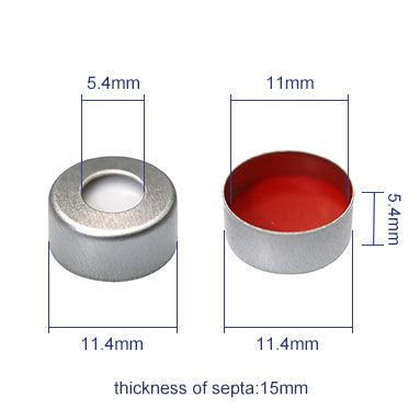 | Description | White PTFE/Red Silicone Septa, 11mm Crimp-top Aluminum Cap, 5.5mm Centre Hole |
