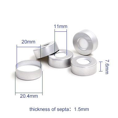| Description | White PTFE/White Silicone Septa, 20mm Crimp-top Aluminum Cap, 10mm Centre Hole |